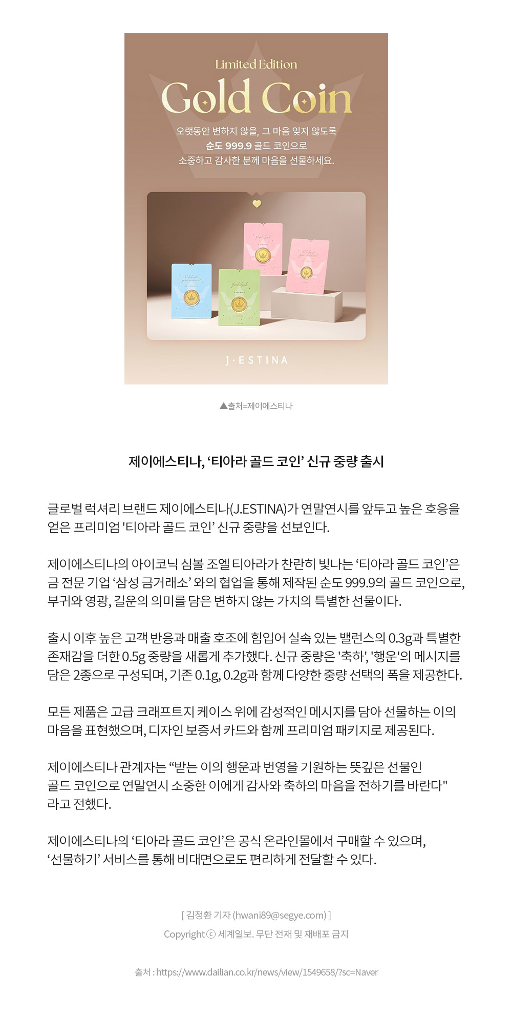 제이에스티나, ‘티아라 골드 코인’ 신규 중량 출시